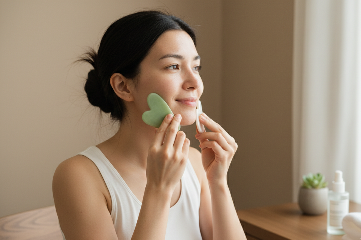 Der traditionelle Gua Sha Stein rundet dein Pflegeritual perfekt ab.